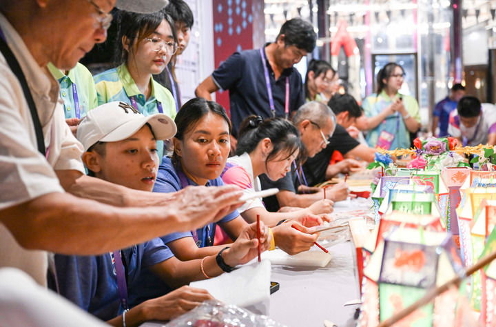 9月25日,在杭州亚运会淳安赛区,泰国运动员(两位紫色衣服者)在观看淳安县里商仁灯的制作过程。新华社记者 胡虎虎 摄