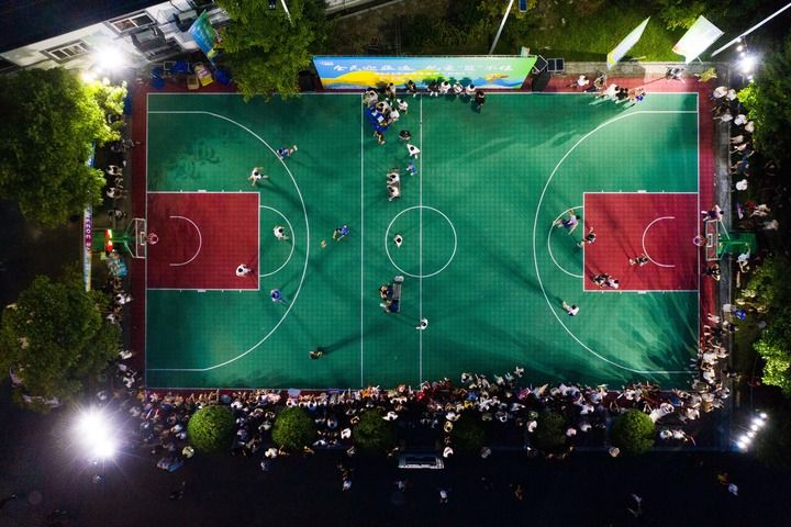 8月5日,在浙江省杭州市临平区塘栖镇三星村篮球场上,球员们在嘉年华比赛中拼抢(无人机照片)。新华社记者 徐昱 摄