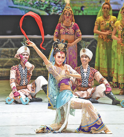 截至今年6月,舞剧《丝路花雨》在40多个国家和地区演出3899场。图为甘肃省歌舞剧院演员在表演《丝路花雨》。