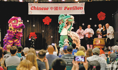 爱好中国武术的习练者们在加拿大萨斯喀彻温省贾纳多元文化节“中国馆”的活动中表演舞狮。