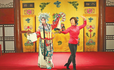 江苏南通大学外籍教师周佳(左)在江苏南通伶工学社体验京剧。