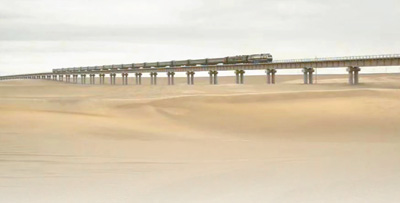 沿着塔克拉玛干沙漠修建的和若铁路,是国内最长的运用“以桥代路”方案防治风沙侵害的铁路。铁轨铺在桥上,桥下留出地方给沙子通过,以降低沙漠对铁路的影响。