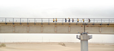打开桥梁安全通道门,高长红逐级登上120级台阶来到桥面。眼前是一片沙海,大风掀起一阵沙尘扑面而来。系好安全绳,掀开检查通道27公斤重的铁质盖板,他从桥面顺着仅容一人上下的铁梯,下探到桥墩墩台,开始检查桥墩与桥梁的连接部。