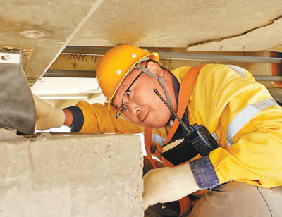 若克雅特大桥一共有278座桥墩,每座桥墩都要仔细检查。墩台空间狭窄,高长红需要保持半跪或侧卧的姿势,一俯身就是20多分钟。“夏天时还好,冬季穿得多,挤在这里更难。”高长红说。