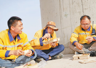 太阳越来越高,高长红眯了眯眼,招呼队员吃午饭。大家躲在桥墩背风处,围坐一圈,分好带来的饭菜。高长红一手捂着饭盒边缘挡着沙尘、护着饭菜,一手快速把饭往嘴里扒。“作业地距离驻地远,为了节省时间,我们常常自己带饭。”高长红说,“这里一年有200多天在刮风,我们习惯了就着沙子吃饭,吃快点就能少吃两口沙子。”(本报记者 李亚楠)