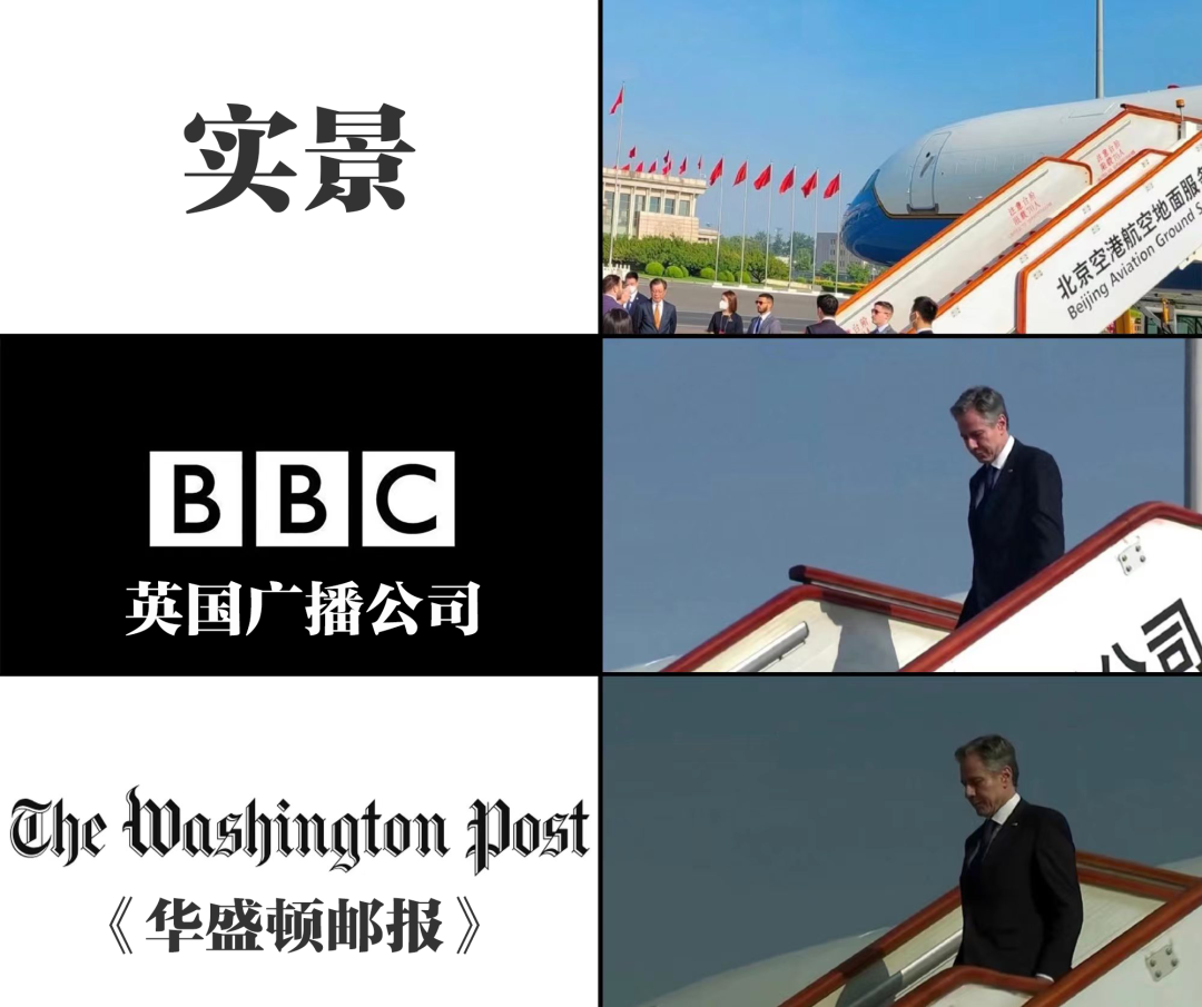 ▲2023年6月,美国国务卿布林肯访华期间,一些外媒强行将有关场景加上“灰黑滤镜”,甚至不惜把布林肯P成“黑人”(自上而下分别为实景、英国广播公司滤镜图和美国《华盛顿邮报》滤镜图)。
