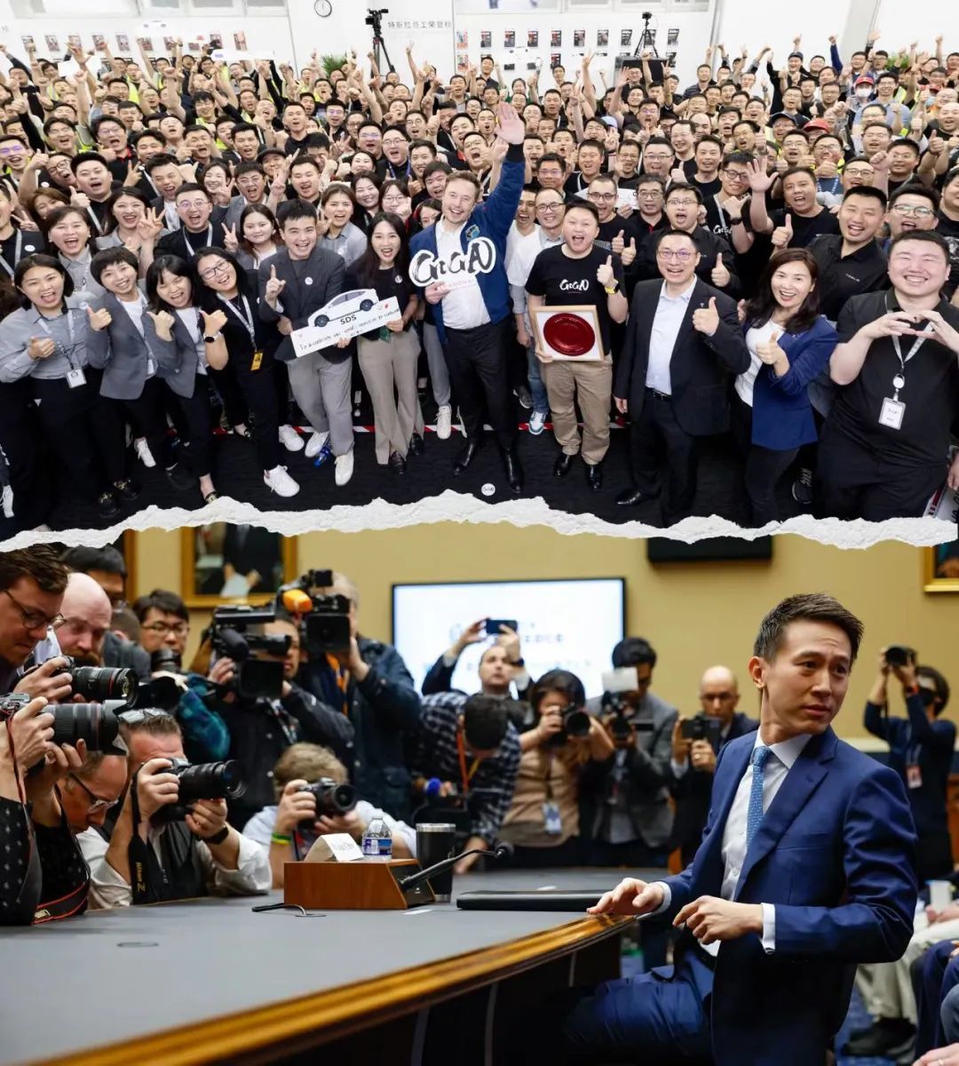 ▲上图为2023年5月,特斯拉首席执行官马斯克到访特斯拉上海超级工厂,受到热烈欢迎;下图为2023年3月,TikTok首席执行官周受资在美国国会听证会上遭到轮番盘问。