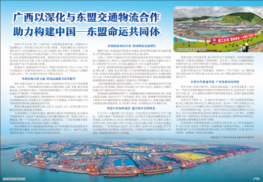 近年来,随着跨境物流运输规模的不断扩大,广西加快发展多式联运,整合港口、铁路、航空等资源,大力培育跨境物流运输体系,推动成立中国—东盟多式联运联盟,初步形成北部湾港海铁联运班列、中越跨境班列、中国—中南半岛跨境公路班车等多种物流组织模式,推动通道跨境物流规模持续高速增长,通道运行质量和水平显著提升。