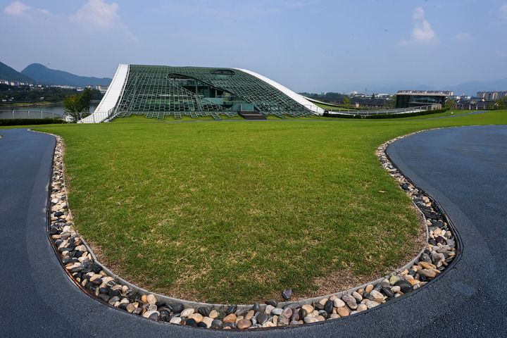 这是8月24日在杭州富阳水上运动中心拍摄的屋顶花园的草坪和步行道,雨水通过鹅卵石过滤下渗,循环利用。新华社记者 徐昱 摄