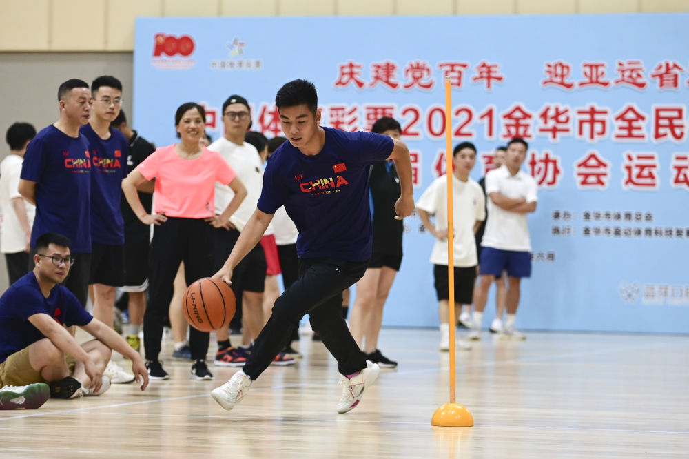 2021年6月11日,在浙江省金华市体育中心体育馆举行的“2021金华市全民健身运动会暨首届体育协会运动会”上,参赛选手在进行篮球技巧挑战赛。金华市体育中心体育馆是杭州亚运会藤球项目比赛场馆。新华社发(胡肖飞 摄)
