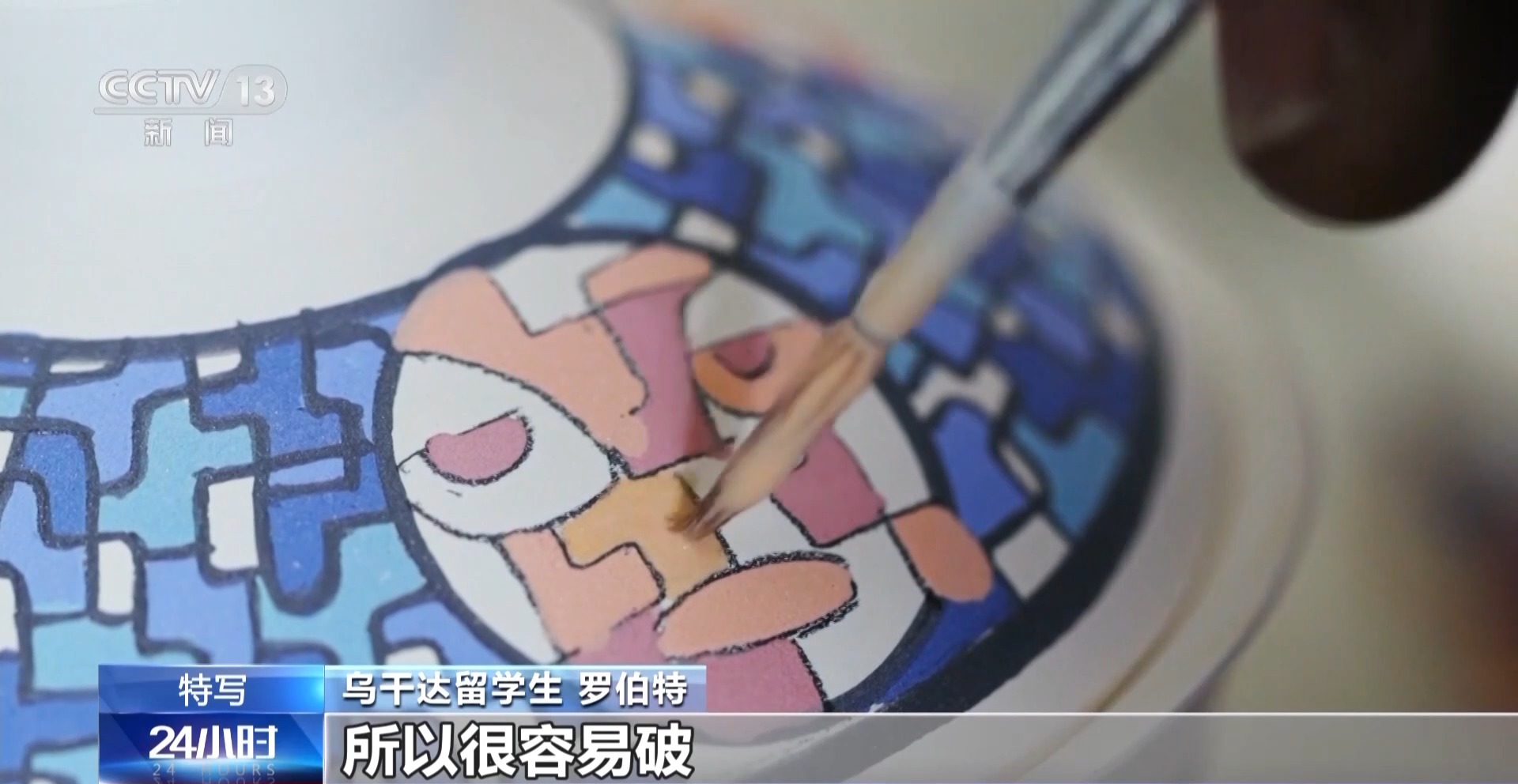 乌干达留学生 罗伯特:要小心一点,已经干了,但还没烧出来,所以很容易破。乌干达的面具,是代表平安。我拿面具做一些作品,表达我们对平安的向往。