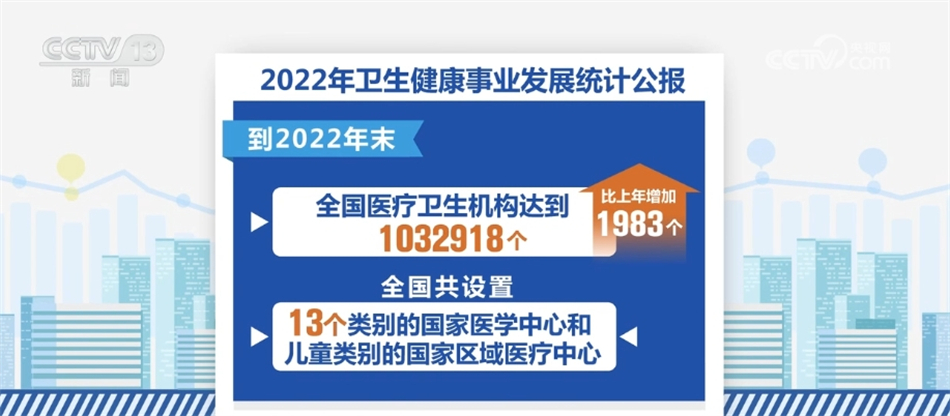 《公报》显示,我国医疗卫生资源总量继续增加。到2022年末,全国医疗卫生机构达到1032918个,比上年增加1983个。全国共设置13个类别的国家医学中心和儿童类别的国家区域医疗中心。全国医疗卫生机构床位975.0万张,每千人口医疗卫生机构床位数由2021年的6.70张增加到2022年的6.92张。全国卫生人员总数1441.1万人,比上年增加42.5万人。每千人口执业(助理)医师3.15人,每千人口注册护士3.71人。