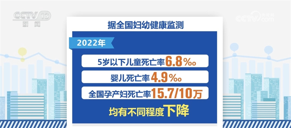 在妇幼健康方面,2022年我国孕产妇产前检查率97.9%,产后访视率96.5%。与上年比较,产前检查率和产后访视率均有提高。2022年全国住院分娩率为99.94%,基本实现全部住院分娩。据全国妇幼健康监测,2022年,我国5岁以下儿童死亡率6.8‰,婴儿死亡率4.9‰,全国孕产妇死亡率为15.7/10万,均有不同程度下降。