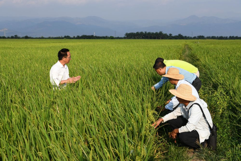 6月20日,在布隆迪布班扎省吉汉加县,中国援布农业专家组与翻译在一处杂交水稻田考察。(新华社记者韩旭摄)
