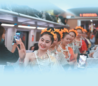 4月13日,以中方为主投资建设的中老铁路从中国昆明南站、老挝万象站双向对开国际旅客列车,两地乘火车可当日通达。图为老挝工作人员在列车上为旅客表演节目。新华社记者 邢广利摄