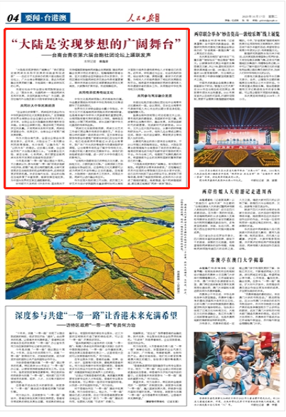 “大陆是实现梦想的广阔舞台”“我们要坚定做两岸关系和平发展的实践者和促进派”……在近日于北京举办的第六届台胞社团论坛上,广大台商台青踊跃发言,表达为两岸融合发展贡献力量、为祖国统一事业添砖加瓦的心声。
