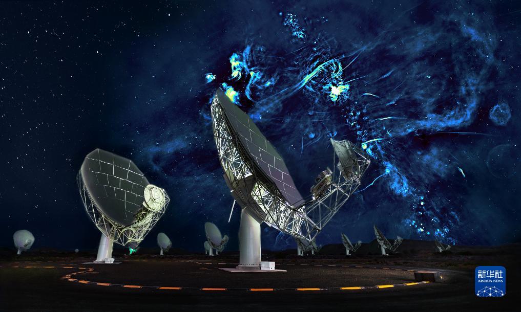 这是“平方公里阵列”射电望远镜项目(SKA)先导项目MeerKAT射电望远镜与其观测到的银河系中心的巨大射电频段气泡示意图(合成照片)。新华社发(受访者供图)