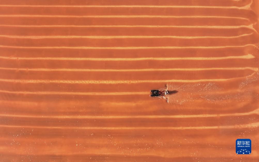 10月14日,工人在河北省滦南县嘴东经济开发区盐场收获秋盐(无人机照片)。