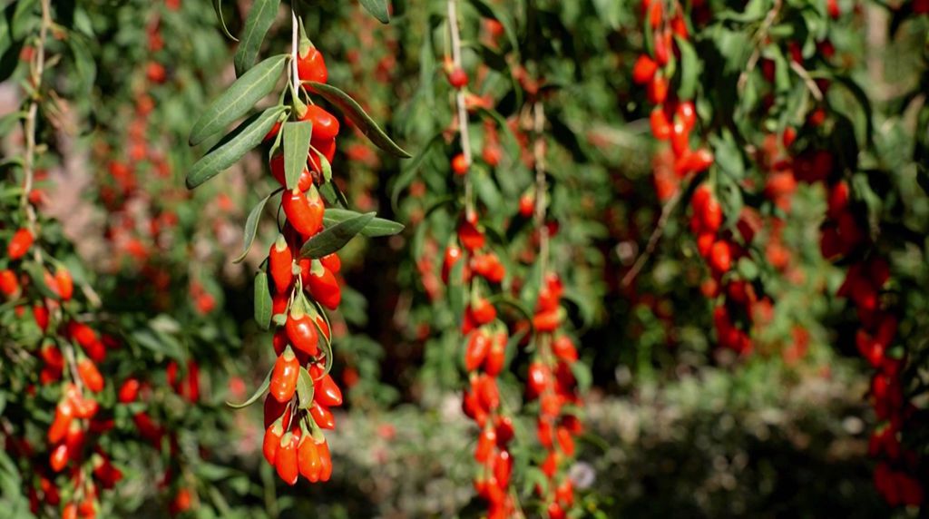 秋日柴达木盆地,数十万亩枸杞挂满枝条 红艳动人。在海西蒙古族藏族自治州都兰县,农民正忙着采摘、晾晒。
