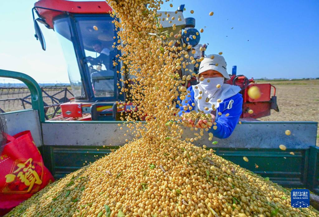10月14日,在河南省洛阳市孟津区会盟镇黄河岸边的下古村,农民收获大豆。