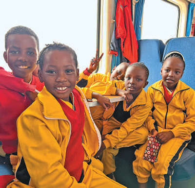 蒙内铁路是中国与肯尼亚共建“一带一路”标志性工程。图为肯尼亚学生高兴地乘坐列车出行。本报记者 张志文摄