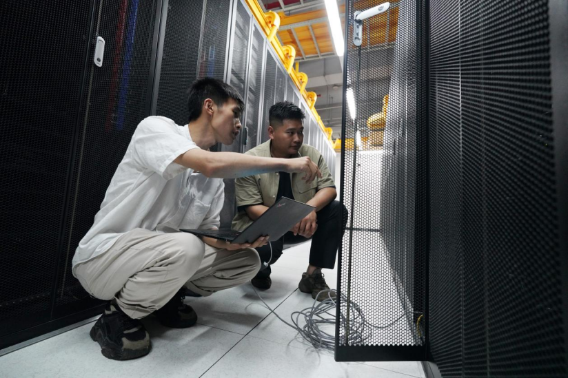 王世海(左)和祝凯强(右)正在机房开展部署工作 海外网 谢明/摄