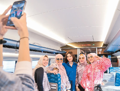 10月17日,乘客在行驶中的雅万高铁高速动车组列车车厢内拍照。新华社记者 徐 钦摄