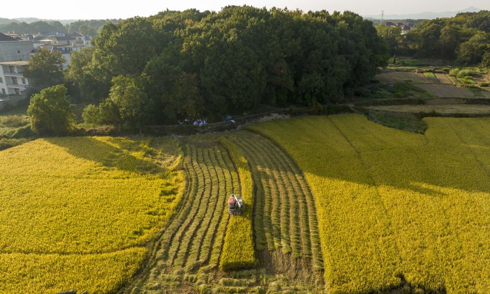 10月18日,在江西省九江市都昌县汪墩乡七星村,农民驾驶农机收割稻谷(无人机照片)。 新华社发 傅建斌 摄