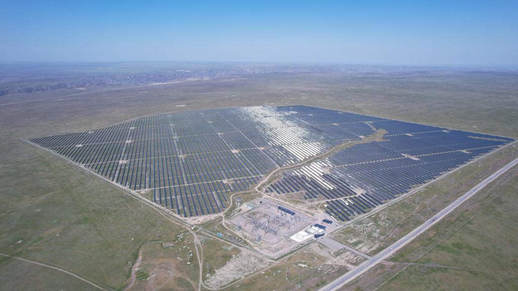 这是5月4日在哈萨克斯坦阿拉木图州拍摄的卡普恰盖100兆瓦光伏电站(无人机照片)。这是哈萨克斯坦单体最大的光伏发电项目之一,也是中哈绿色能源合作项目之一。新华社发(奥斯帕诺夫摄)