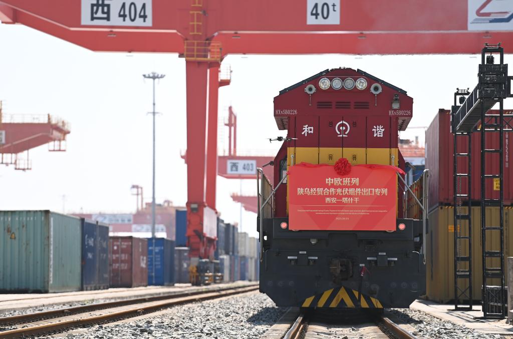 8月3日,中欧班列(西安-塔什干)陕乌经贸合作隆基绿能光伏组件出口专列在西安国际港站准备发车。新华社记者 邹竞一 摄