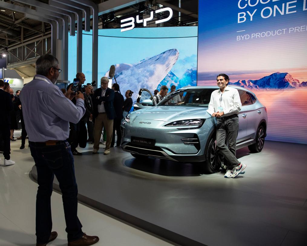 9月4日,在德国慕尼黑国际车展媒体预展上,参观者在比亚迪品牌发布会现场与BYD SEAL U汽车合影。新华社记者 张帆 摄