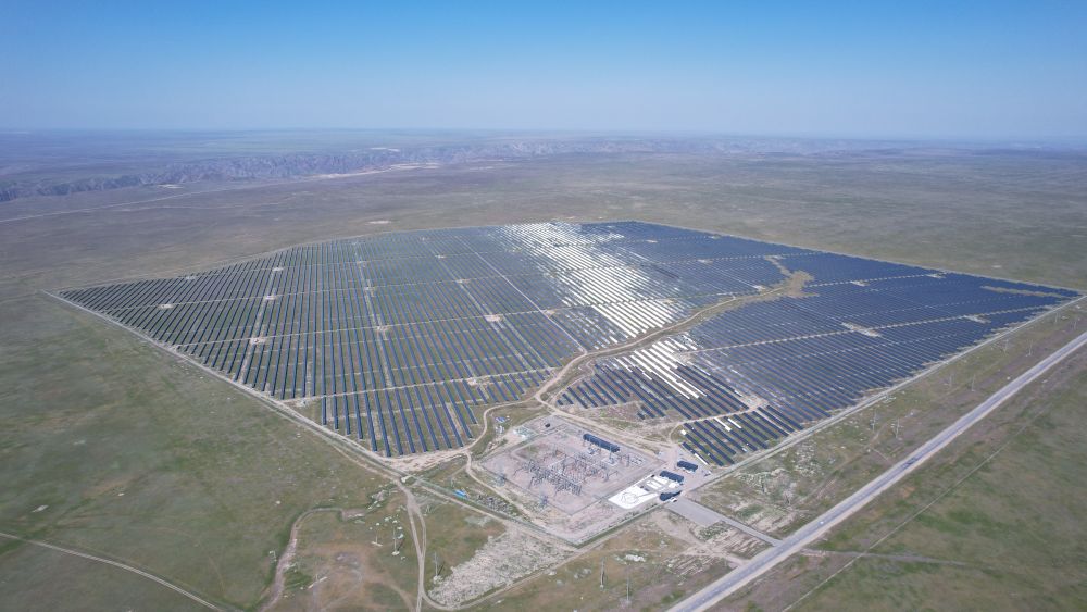 这是5月4日拍摄的哈萨克斯坦阿拉木图州卡普恰盖100兆瓦光伏电站(无人机照片)。这里的太阳能光伏板通过中欧班列运输至此。