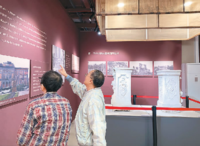 李炳仁(右)和刘尚平两位老人在参观“圆明园石柱回归展”。