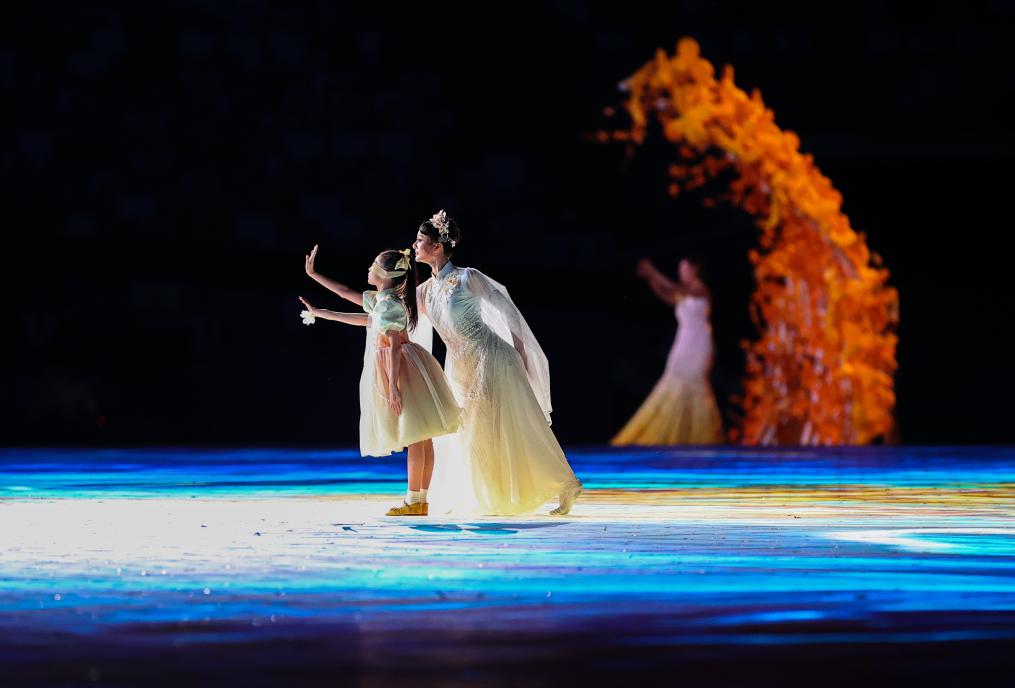最后一个表演单元《梦闪耀》中,“金桂花”化作手鼓汇聚场中,用鼓声为运动员加油呐喊,引得全场掌声雷动;随后,失去左手的游泳运动员徐佳玲用智能仿生手紧握名为“桂冠”的火炬,将主火炬点燃,全场气氛达到高潮。