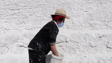 工作人员将牛奶、蜂蜜、藏红花、白灰等材料按比例混合,经过滤后对布宫墙体进行喷涂,这样既可以保护建筑物表面不受腐化变质,也可更加美观。