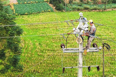 眼下正值农闲时节,为保障农业生产用电,四川和源电力有限公司华蓥分公司对辖区以农业园区为主的10kV高偏线、10kV高花线联络线路, 实施新建和提档升级改造。图为该公司员工在架设供电线路。