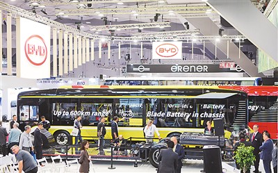 比亚迪选择在此次展会上全球首发两款纯电动巴士,其中一款纯电动大巴搭载了全新刀片电池底盘,单次充电续航高达600公里,保障长途高效运营,为城际公共交通提供更便捷的解决方案。比亚迪欧洲分公司大巴销售部副总经理让威尔·巩提乔表示,刀片电池底盘技术将会使车辆更安全、更节能。