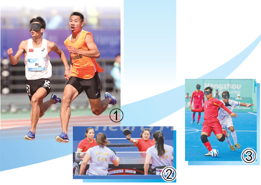 杭州亚残运会赛场上,像陈圣明这样的竞赛辅助人员还有很多。田径项目中的领跑员、引导员,自行车项目中的领骑员,盲人足球队中的守门员……赛场内外,残疾人和健全人互相激励,携手向前。