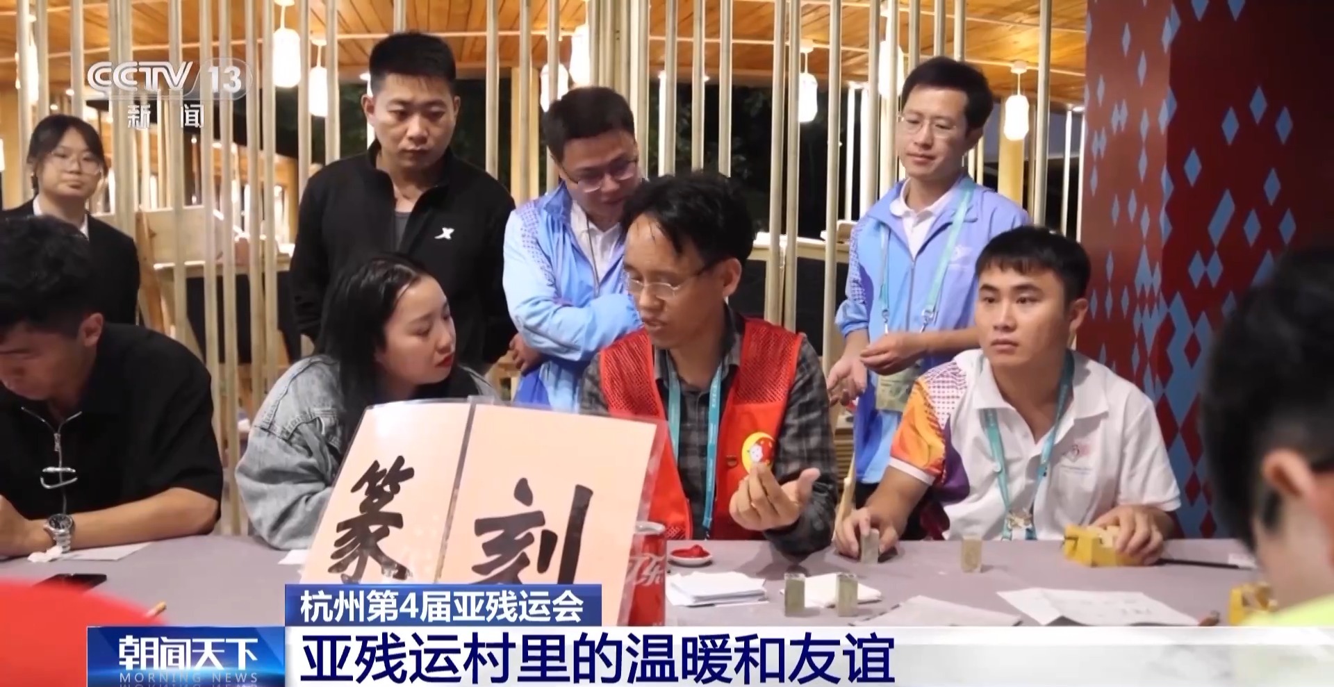 在亚残运村淳安分村,每到傍晚,竹编、木工、剪纸、篆刻等多个非遗项目轮番展出,给大家留下深刻的杭州记忆。来自泰国代表团自行车队的沃拉优•卡普亚,几乎每天都会和同伴前来体验,他说,每天都有新感受。