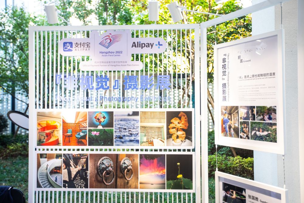 在亚残运村举行的“非视觉”摄影展,展览作品全部由视障人士拍摄。志愿者会现场讲解摄影展背后的故事,帮助参观者们戴上眼罩,体验“非视觉”摄影。