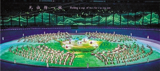 眼前,是百名大学生构成的茶礼方阵,现场吟诵唐朝诗人白居易诗作《山泉煎茶有怀》,尽诉离别之情。地屏画面,从宋代绘画和图案中汲取灵感,以中国风的天青色为底,并用现代的视觉语言表现出茶水润泽的气韵。鼻间,弥漫的是浓郁茶香,仿佛置身于西湖百亩龙井茶田,流连忘返。