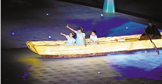 点点星光充盈在“大莲花”的网幕和地屏上,夜空中,整个场馆仿佛置于漫天星空下。一束追光落下,一艘小小的古船载着3名可爱的孩子缓缓驶向舞台中央,好似畅游在梦想的星河。