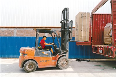 在百川国际物流公司仓库外,工人用叉车装货。本报记者 彭训文摄