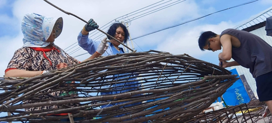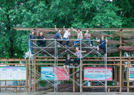 西口村村民参与编织《连年有鱼》。清华大学美术学院项目团队供图