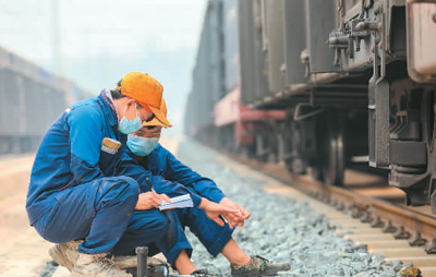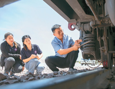 在老挝首都万象北郊的中国中铁二局中老铁路铺轨基地,老挝姑娘希达·平蓬莎万(中)跟着中国师傅(右)检查列车。凯 乔摄