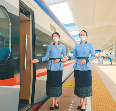 在中老铁路老挝万象站,中老方乘务员按照中国铁路乘务标准,迎接世界各国旅客。杨永全摄