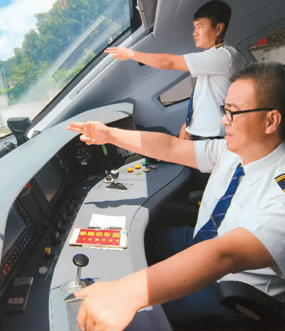 中方司机与老方副司机一同值乘“澜沧号”国际旅客列车。杨永全摄