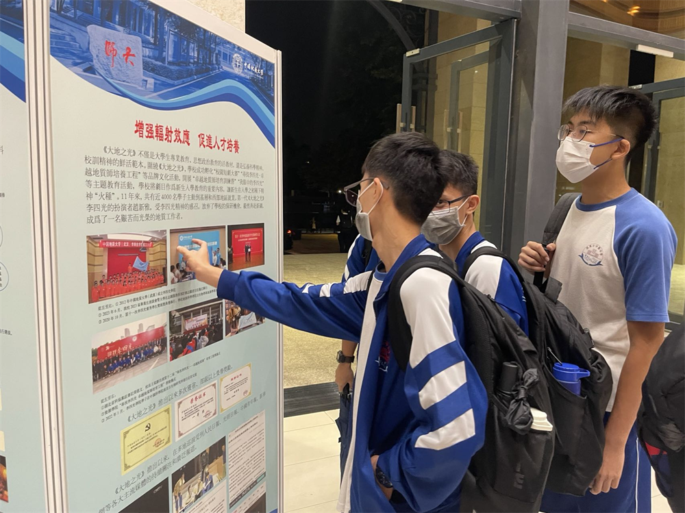 图为澳门高美士中葡中学的同学们在观看演出之后参观剧场外精心布置的李四光生平事迹展。(记者富子梅摄)
