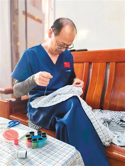 这天夜里,胡国东反复思考如何才能利用现有条件缓解患者病痛。他想到一招,取出了自己从国内带来的崭新床单和针、线、剪刀。作为一名外科医生,胡国东曾无数次在手术台上用手术剪和缝合针线为患者接骨矫形、解除病痛,可在异国他乡做针线活却还是头一遭。就这样,他一直忙到深夜,终于为患者缝制成了一个标准的外科用腹带。