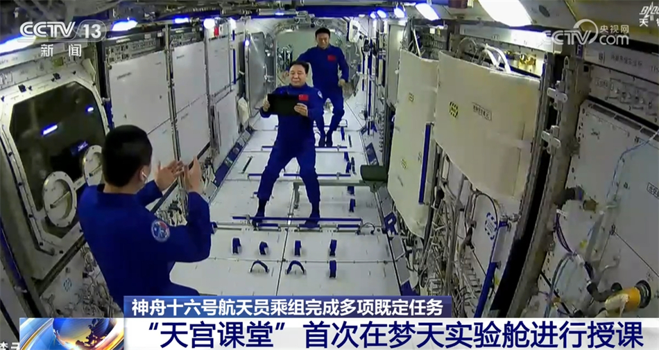 9月21日15时48分,“天宫课堂”第四课在中国空间站开讲,这是首次在梦天实验舱内进行授课。神舟十六号航天员第一次带领大家巡游梦天实验舱,介绍了各类实验机柜。在48分钟的授课中,三名航天员在轨演示了球形火焰实验,这是首次在空间站开放空间内进行燃烧实验的展示,以及使用水球进行了奇妙“乒乓球”实验,还有经典物理学动量守恒实验和从神十授课就一直伴随“天宫课堂”的陀螺实验,最后航天员们还和地面课堂的同学们进行了互动交流。